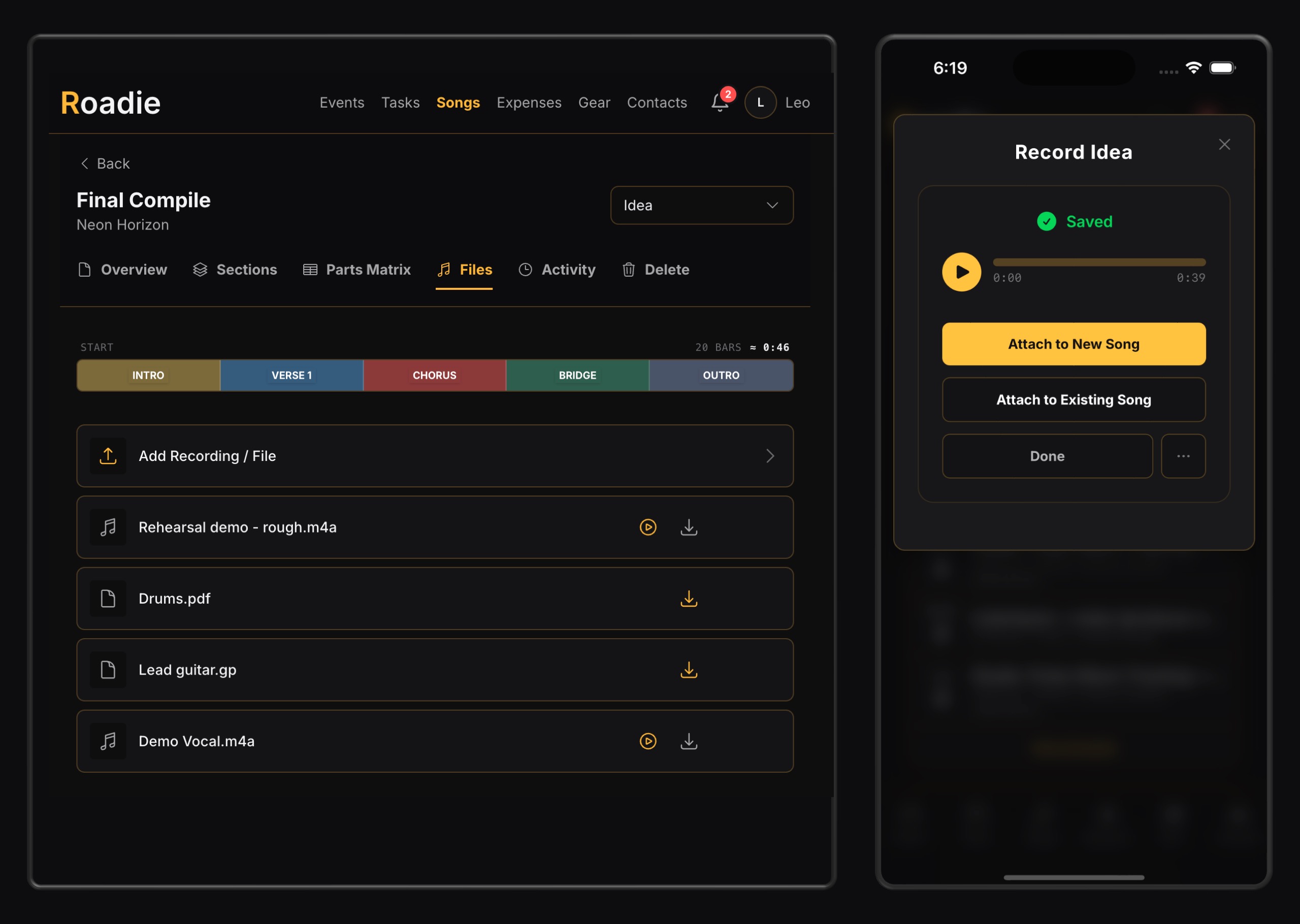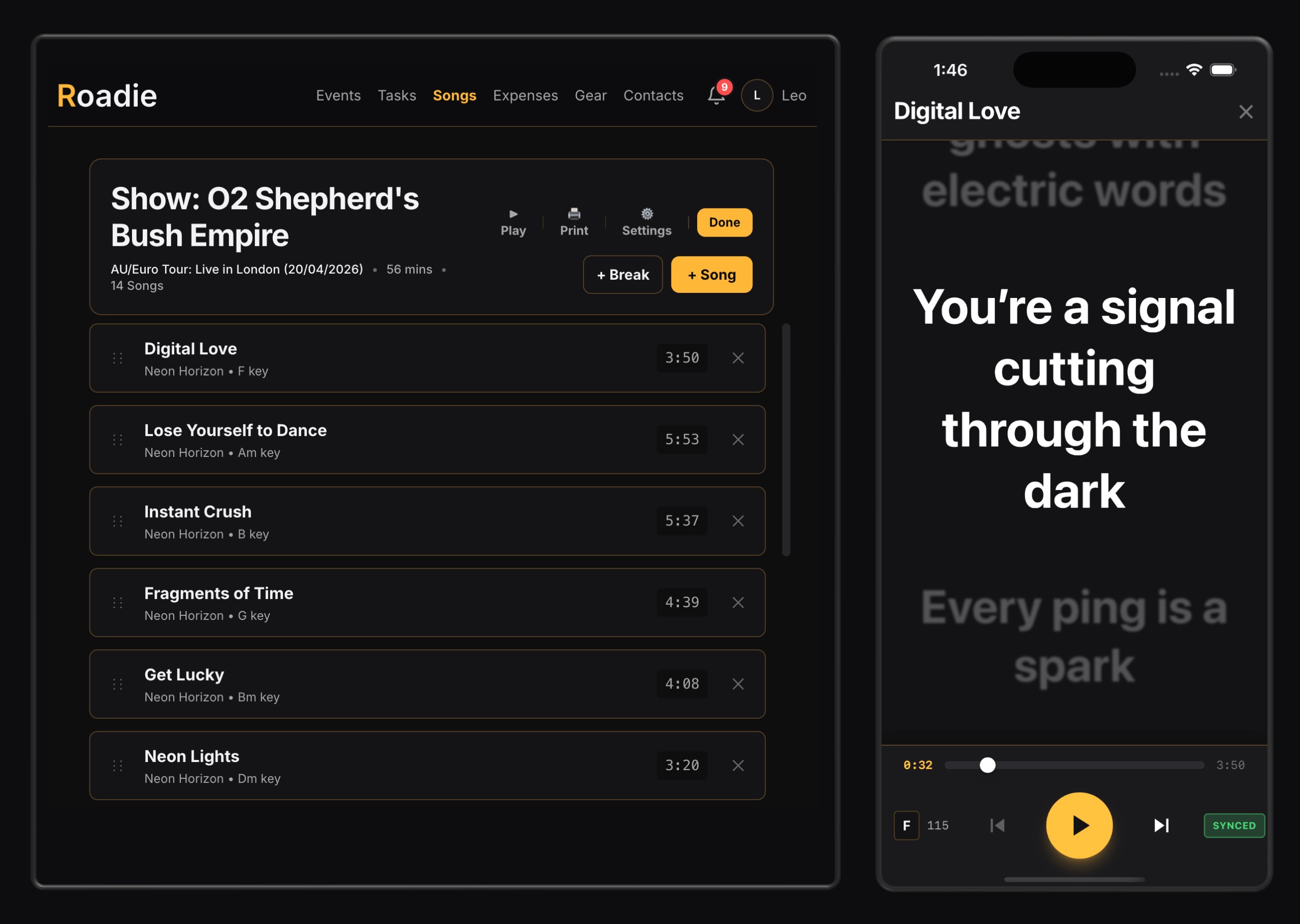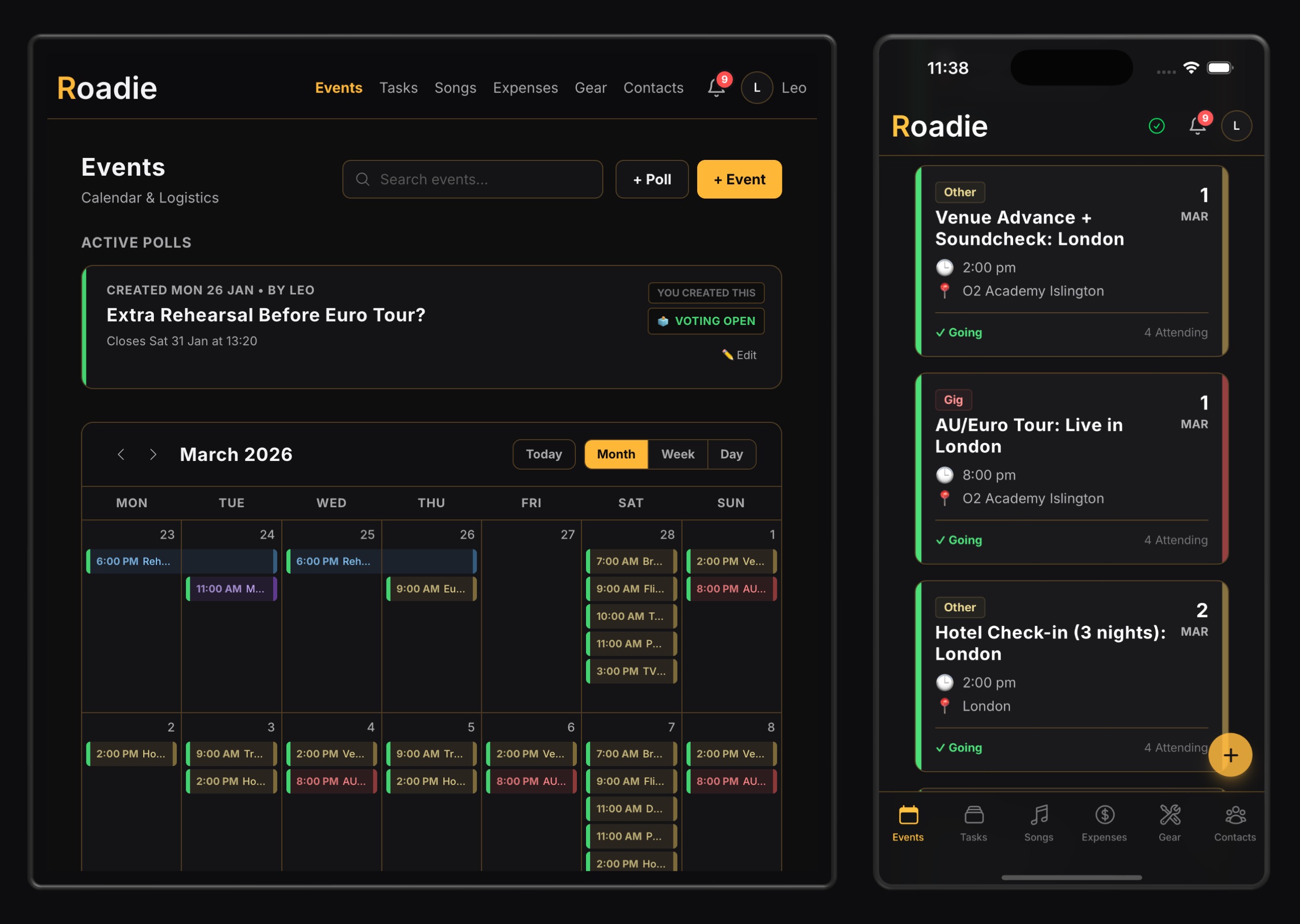 Roadie brings gigs, rehearsals, tasks, gear, and expenses into one focused workspace. Built for bands who juggle day jobs, side projects, and late-night load-outs.